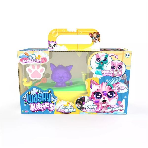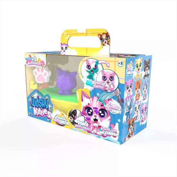 O conjunto de brinquedos Washy Friends Color Reveal gatinho de banho oferece uma experiência única para as crianças, permitindo que cuidem do gatinho. O gatinho chega com um pelo "lamacento", e só após o banho é que se revela a cor e o padrão do pelo.